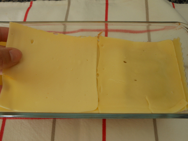 A continuación coloca las tres lonchas de queso y continúa con el resto de la carne.