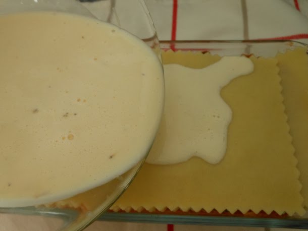 Vierte la salsa Royal por encima y deja que la salsa resbale por entre las capas de lasaña y carne.