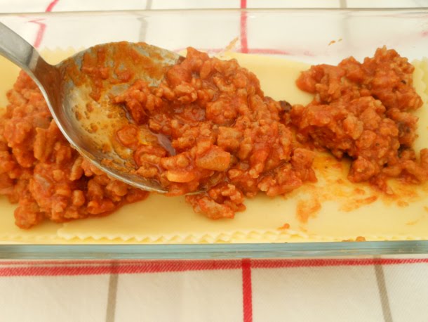 Dispón una parte de la carne con tomate sobre las placas y sobre esta otras tres láminas de lasaña.