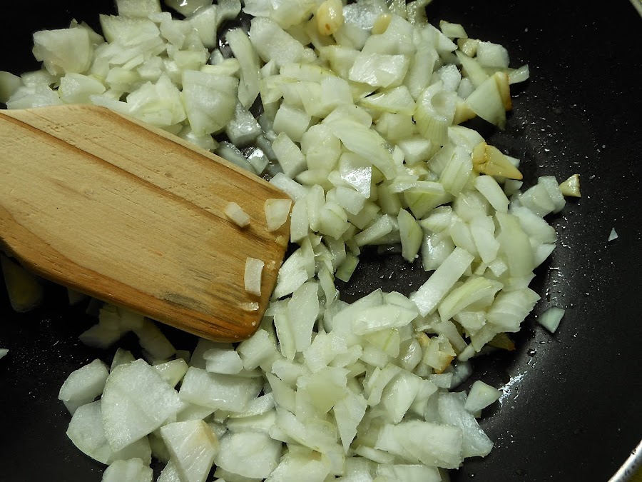 Después agrega la cebolla picada y una pizca de sal fina; baja el fuego al número 4 de la placa vitrocerámica y tapa la sartén. Deja que la cebolla se ablande por espacio de 12 minutos.