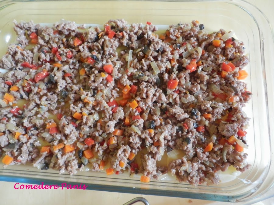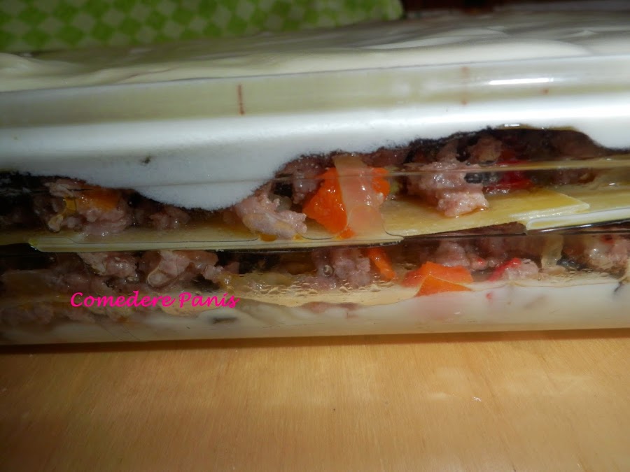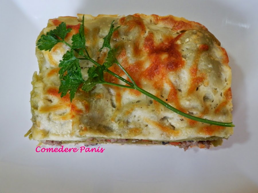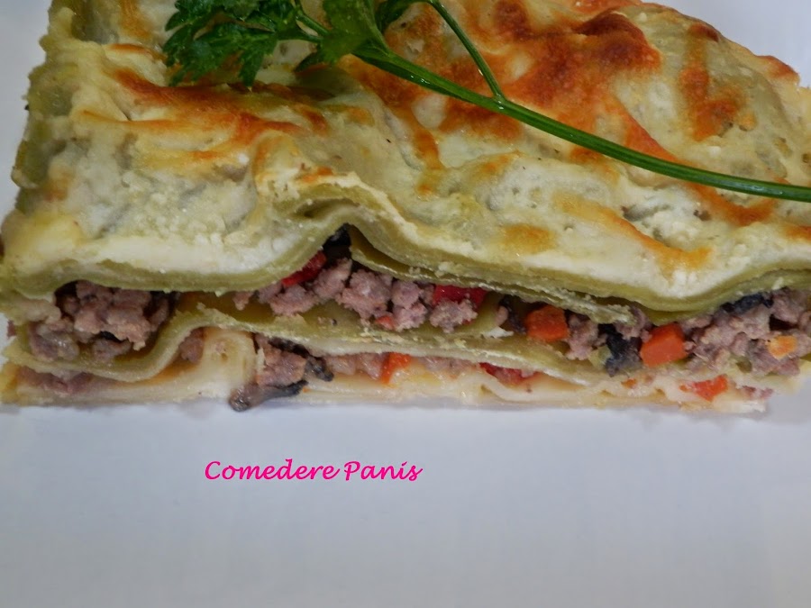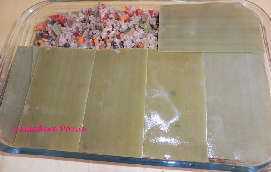 Sobre la lasaña colocar la carne junto con la verdura, agregar otra capa de lasaña, en esta ocasión utilicé dos tipos de lasaña, la capa superior fue lasaña con espinacas.