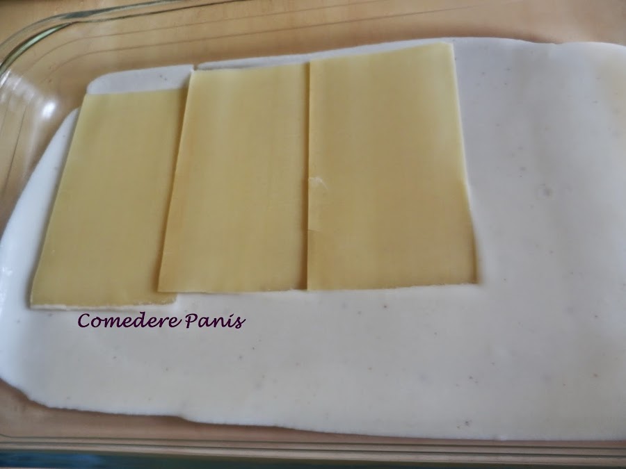 Preparar una bandeja de horno alargada y cubrirla con bechamel, sobre la bechamel colocar una capa de lasaña.