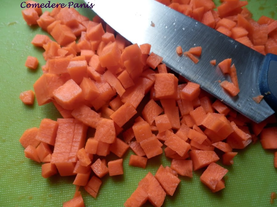 Trocear el pimiento, los champiñones y la zanahoria en trozos pequeños.