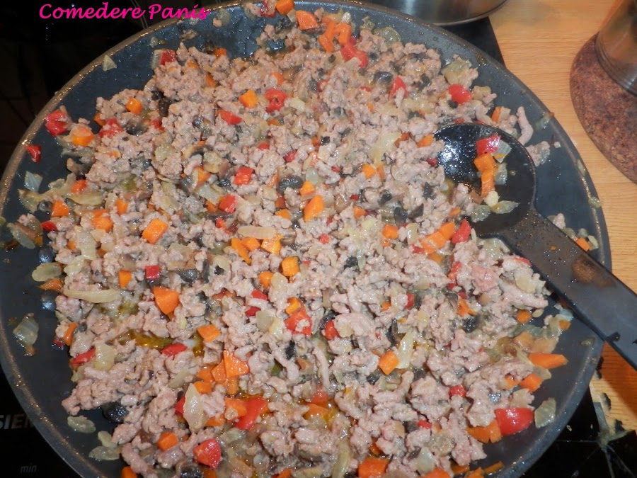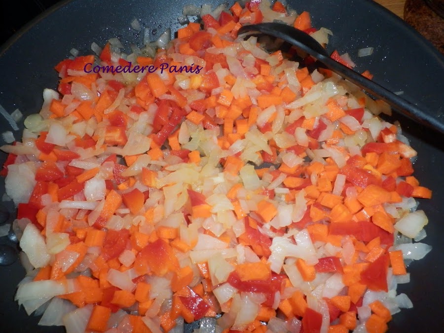 Sofreír la cebolla durante 5 minutos y luego agregar el pimiento y la zanahoria, cuando las verduras estén pochas agregamos los champiñones y rehogamos unos minutos más.