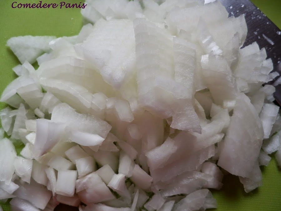 Trocear la cebolla y añadirla a los ajos, el porqué de dorar los ajos antes es algo que me contó mi prima que mi abuela siempre lo hacía, de este modo el sabor del ajo frito es más intenso.