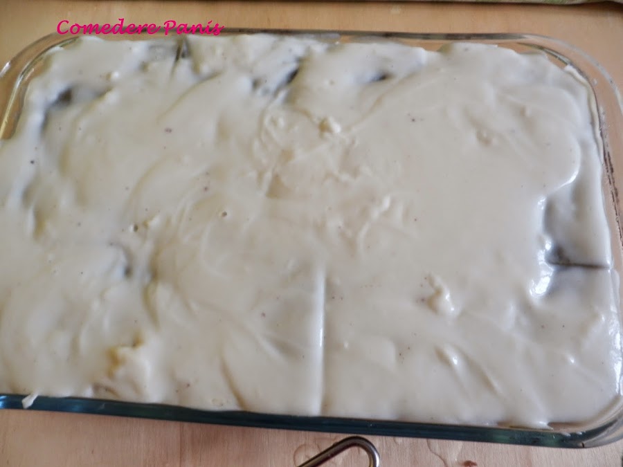 Por último una capa de bechamel y colocar el queso. Introducir en el horno previamente calentado a 180º C durante 20 minutos.