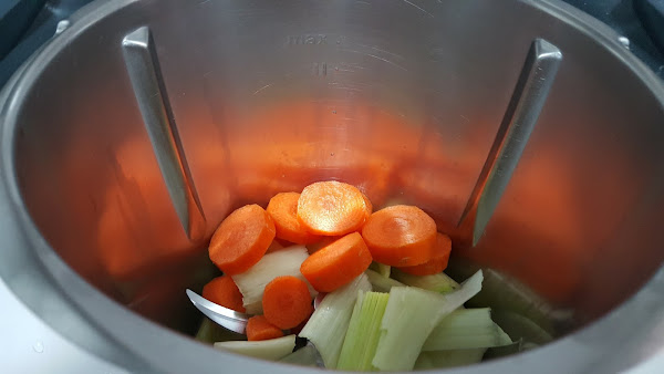 3.- Ponemos en el vaso las verduras y el aceite y trituramos 5 segundos, velocidad 7. Bajamos los restos con la espátula y cocinamos 8 minutos, 120º, velocidad 2.