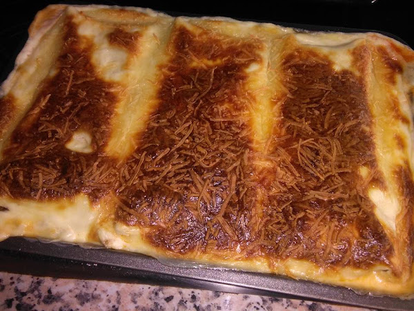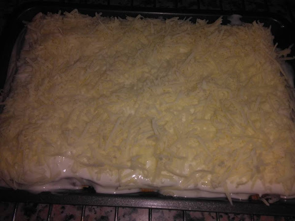 Una vez todo preparado, montamos la lasaña alternando lamina de pasta con la carne. Cuando coloquemos la última de pasta, cubrimos con la bechamel y espolvoreamos con queso rallado.