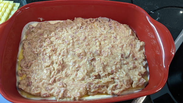 cubrimos con una capa generosa de relleno, las placas de pasta y bien cubierta con la bechamel