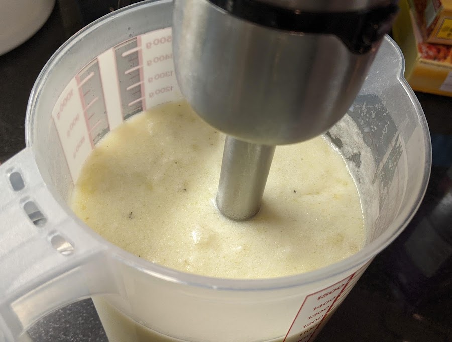 Con este sistema es fácil que quede algún grumo: pasamos a un vaso de batidora y trituramos. Dejamos la salsa bechamel reservada