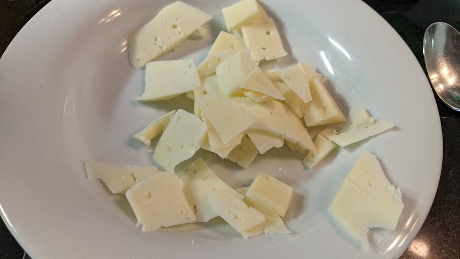 Añadimos la leche y removemos enérgicamente. Salpimentamos y añadimos el queso cortado muy fino; removemos y tapamos (es suficiente con la tapa de cristal) Dejamos que coja temperatura y contamos 4-5 minutos
