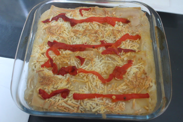 Colocamos sobre el aceite o la mantequilla, las láminas de pasta precocidas (dan mejor sabor las que se tienen que cocer, pero estas son más prácticas).