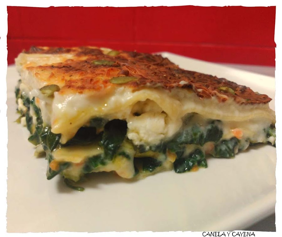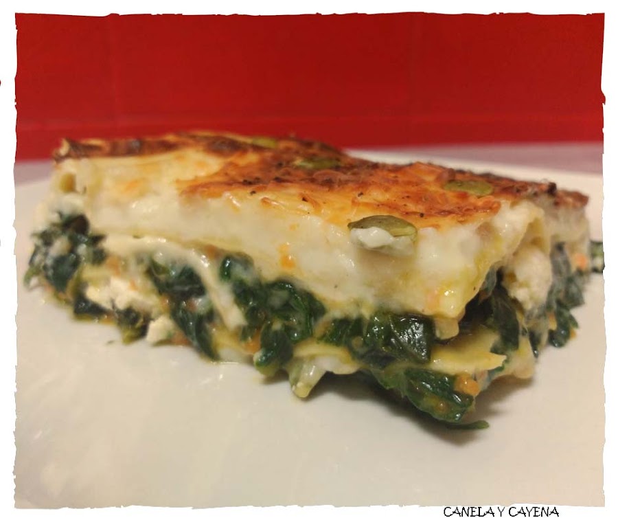 Hoy te traigo una receta propia de lasaña riquísima, donde podrás disfrutar de un delicioso plato sin pensar demasiado en las calorías, ya que es bastante ligera al no llevar sofrito. Se trata de una lasaña de espinacas, queso de cabra y pipas de calabaza con bechamel suave de roquefort.