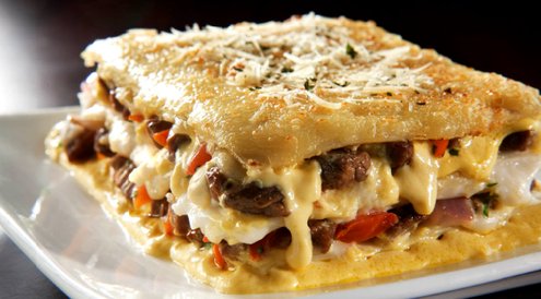 Vierta un tercio de la salsa blanca huancaína en un recipiente refractario de 23 centímetros de largo por 12 de ancho. Cubra con dos láminas de masa wantán y bañe con la mitad de la salsa de lomo. Esparza un tercio del queso mozzarella y tape con dos láminas de la masa. Repita la misma operación hasta terminar con la salsa blanca huancaína y el queso mozzarella y parmesano. Lleve al horno a 180°C durante 35 minutos. Deje reposar unos minutos. y sirva.