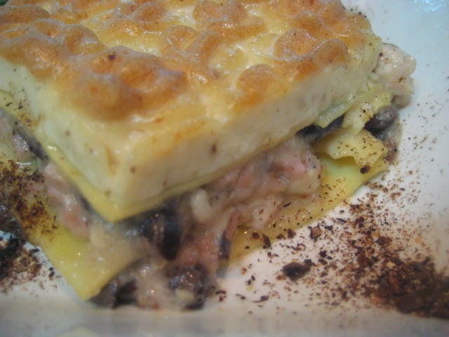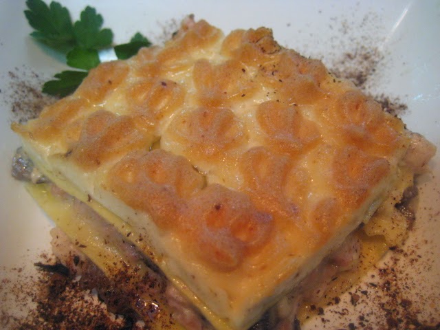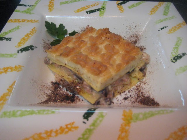 LASAÑA DE POLLO Y SETAS GRATINADA CON MAYONESA DE AJOS CONFITADOS