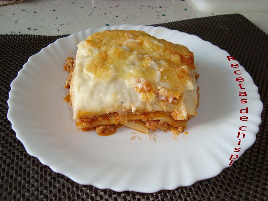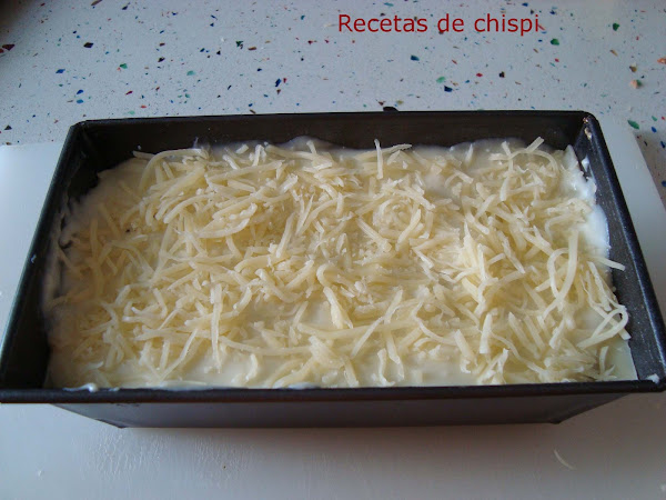Una vez completadas las capas cubrir con la besamel y encima de esta poner el queso rallado.