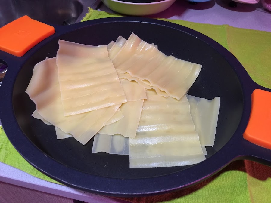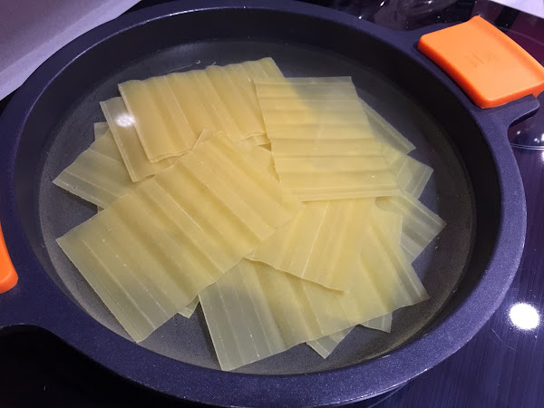 2. En una cazuela ponemos agua a calentar, justo cuando empiece a hervir paramos el fuego. Ponemos 1 caja de las placas de lasaña dentro del agua. Al ser precocidas, estarán listas en 10 minutos. Repetimos este paso con la segunda caja de placas de lasaña.