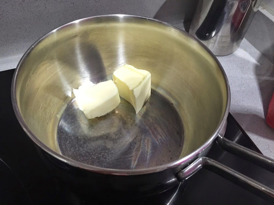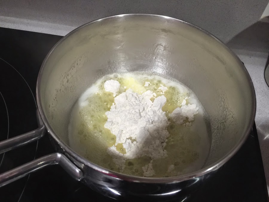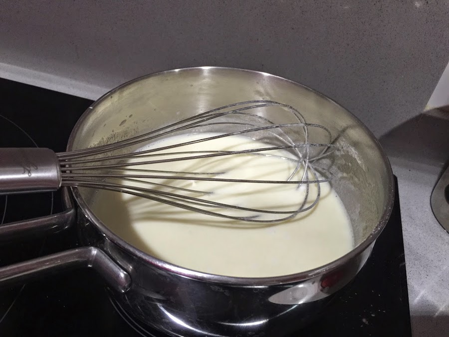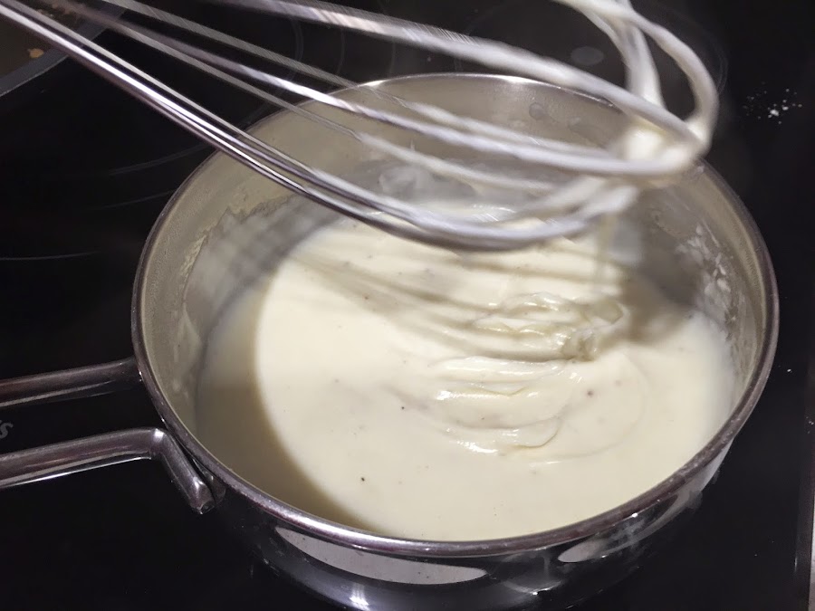 4. Hacemos la bechamel. Para ello, ponemos la mantequilla en la ollita, la derretimos a fuego medio y añadimos la harina. La doramos un par de minutos y poco a poco vamos añadiendo la leche caliente. Batiendo sin parar para que no queden grumos. Añadimos el punto de sal y la nuez moscada. Esperamos a que espese en el punto que nos guste. Si queremos que al cortar la moussaka quede en una pieza conviene que espese mas de lo habitual.