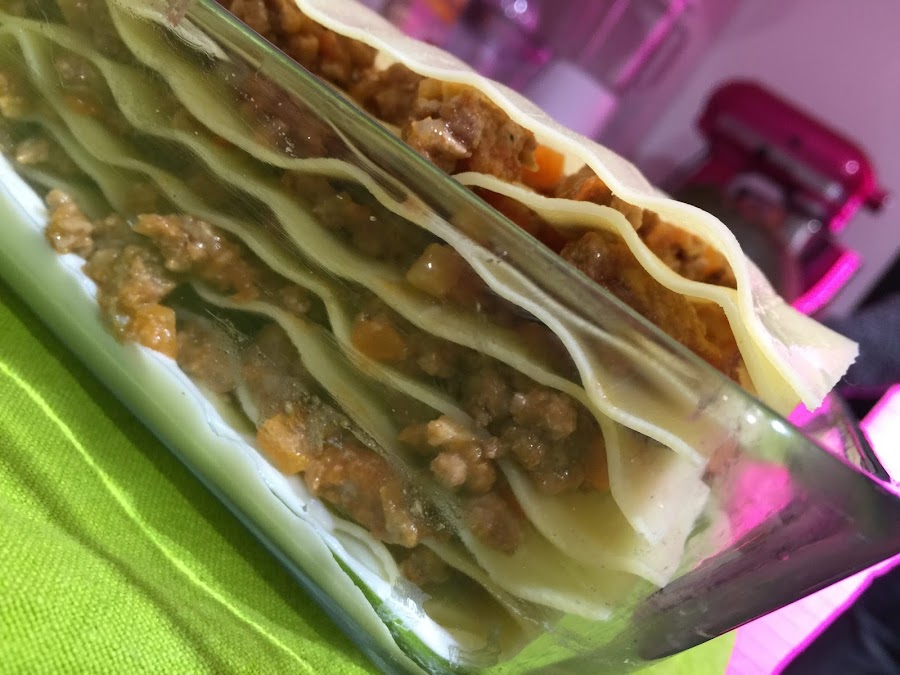 5. Empezamos el montaje de la lasaña. Cubrimos la bandeja de horno con un poco de bechamel, de esta forma evitaremos que se nos pegue la lasaña una vez hecha. Ponemos en el fondo cuatro placas de lasaña y sobre éstas ponemos el ragú a la boloñesa. Me encantan las lasañas altas, por esta razón no relleno exageramente entre capa y capa de pasta, cada lasaña tiene 8 placas de pasta, así que calcular en distribuir el relleno uniformemente. Hay 8 placas de pasta y 7 de relleno de ragú a la boloñesa. En 3 de las 7 de carne he añadido también un poquito de bechamel encima para que quede más jugosa. Sobretodo repartir el relleno por toda la superficie de la pasta, al ser tan alta conviene darle estructura para que no se caiga, y la manera es repartiendo el relleno bien por todas las esquinas.