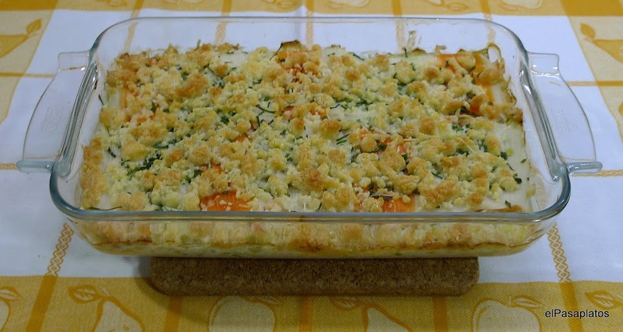 Para hacer la cobertura, derretir en el microondas dos cucharadas de mantequilla y mezclar con una cucharada colmada de harina en un cuenco. Rallar encima los quesos elegidos y mezclar con las manos para que se formen pegotes. Distribuir sobre la lasaña.
