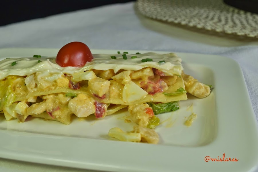 Seguidamente ponemos la mezcla de pollo, otra capa de pasta de lasaña y así sucesivamente hasta que tengamos 3 pisos.