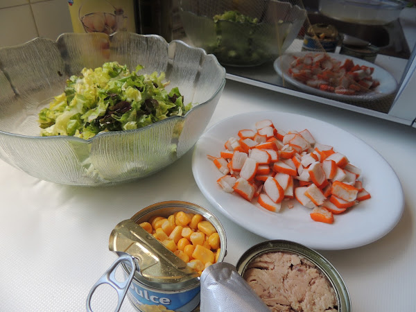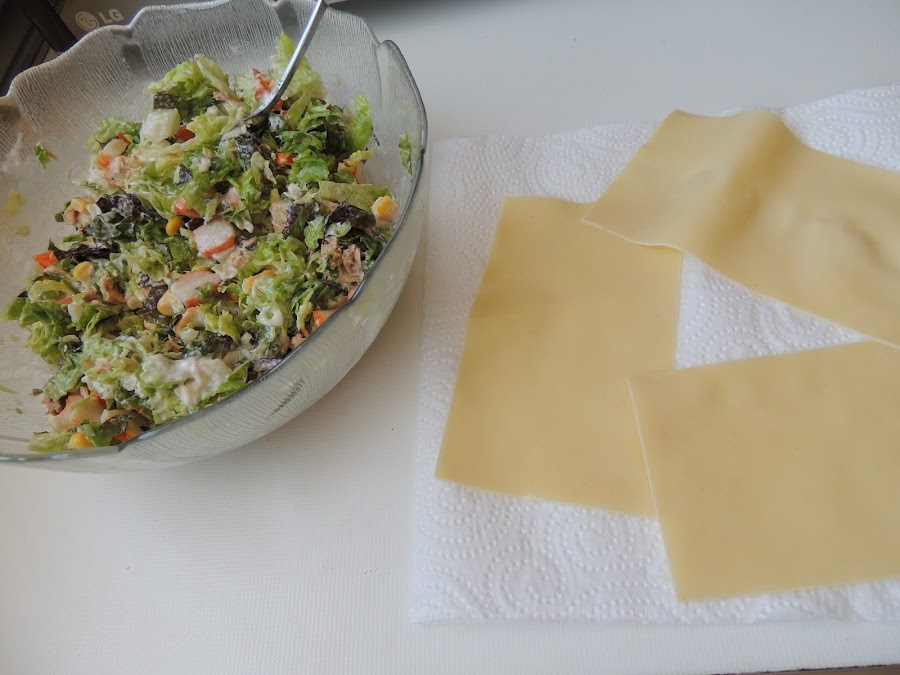 A continuación preparamos el relleno. Cortamos la lechuga muy pequeña y las barritas de surimi a rodajitas.