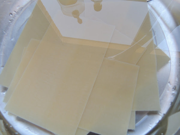 Lo primero que haremos es poner las láminas de lasaña en agua caliente según indica el paquete, mínimo usaremos 3 láminas por ración.
