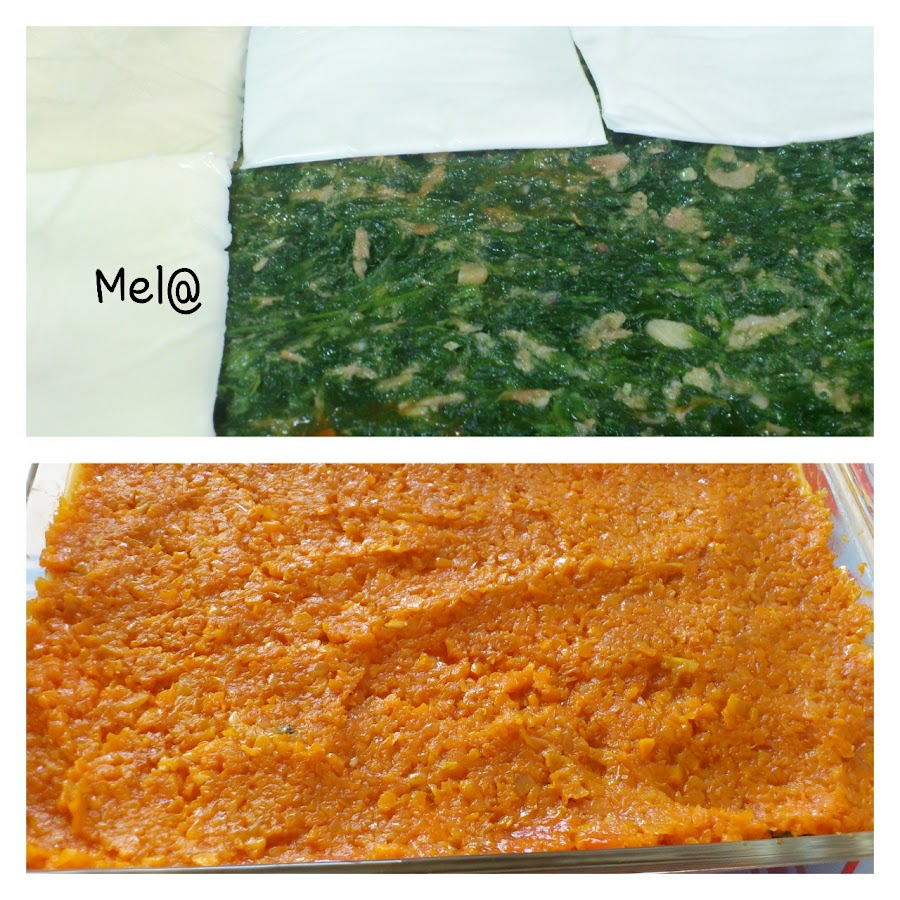 Encima de los tranchetes otra capa de lasaña y sobre ella el sofrito de zanahorias, cebolla y tomate y sobre estas otra capa de lasaña.