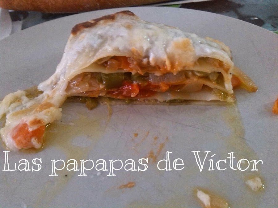 Como si de una pequeña torre se tratara, la lasaña se alza y entre sus capas verdura recién cogida del huerto cerquita de casa y bañando una buena bechamel y coronando un quesito bien gratinado.