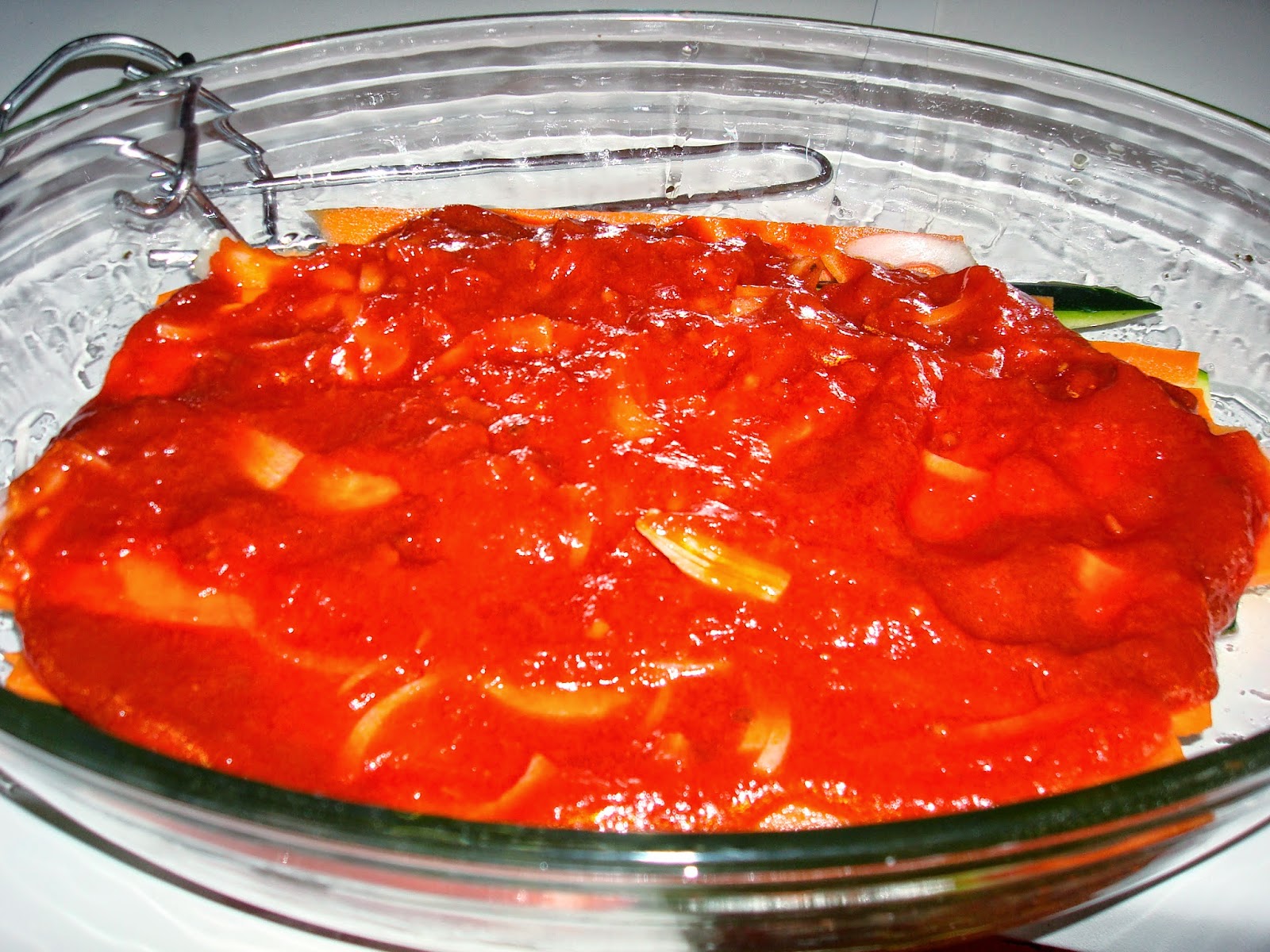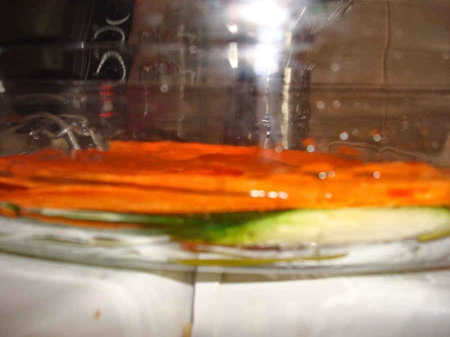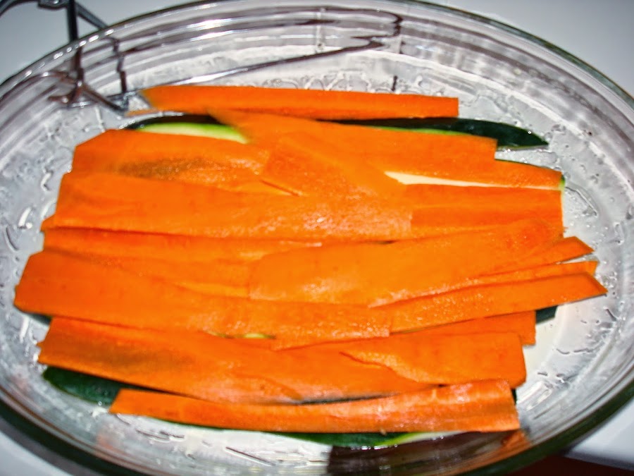 En un bol vamos colocando base de calabazin, zanahoria, cebolla y tomate.