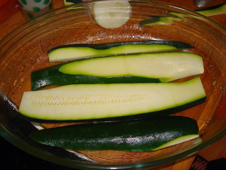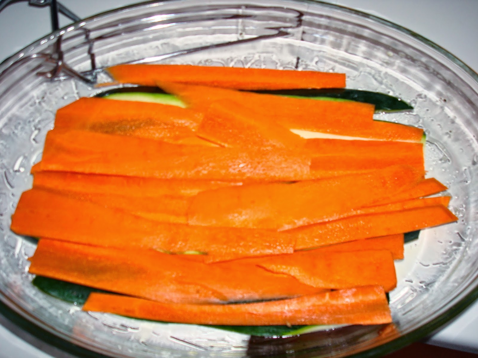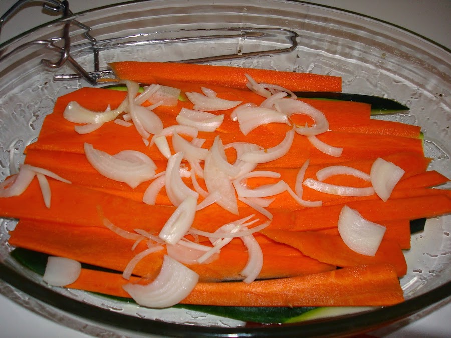 Partimos el calabacin en laminas no muy finas, al igual con las zanahorias y picamos la cebolla.