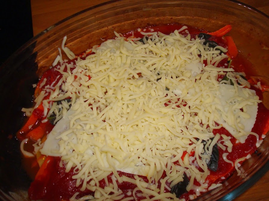 Y así vamos colocando capas hasta que queramos y luego añadimos el queso por encina, podemos añadir también unas laminas de queso.