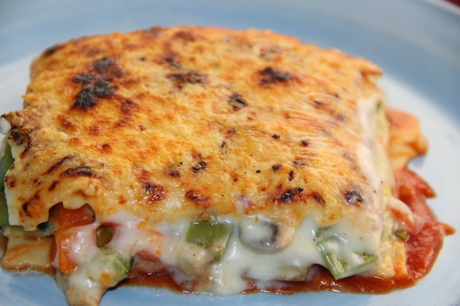 Vamos a montar nuestra lasaña en una bandeja de horno de la siguiente manera: capa de pasta , de verdura , de tomate , pasta , bechamel , verdura , tomate , pasta , bechamel , bien de queso y al horno precalentado a 180° durante 20 25 minutos.