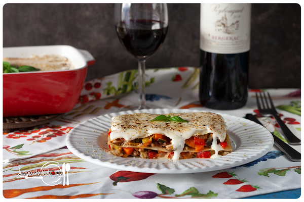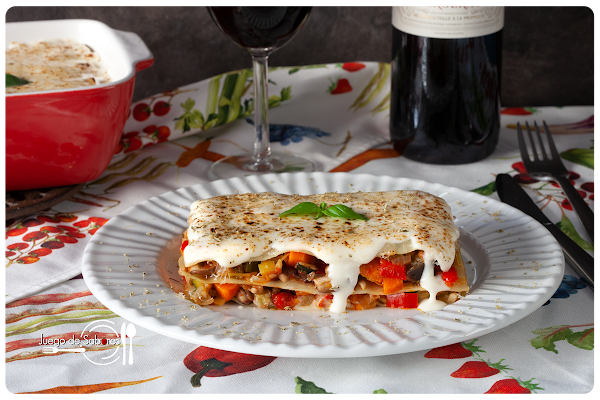 Si hoy tenéis amigos vegetarianos a comer no lo dudéis ni un minuto: haced una lasaña de verduras variadas y os ganaréis el reconocimiento y la gratitud eterna de vuestros comensales. Lasañas las hay de muchas clases. La más frecuente es la de carne en salsa boloñesa y bechamel, pero también se puede hacer de marisco. Un día probaremos. La palabra lasaña se emplea indistintamente para designar el plato en sí o bien las planchas finas de pasta que se colocan alternadas entre la carne picada, las verduras o la bechamel. No hay mayor secreto, pero el resultado es espectacular. Ésta de hoy está hecha con productos de la huerta.