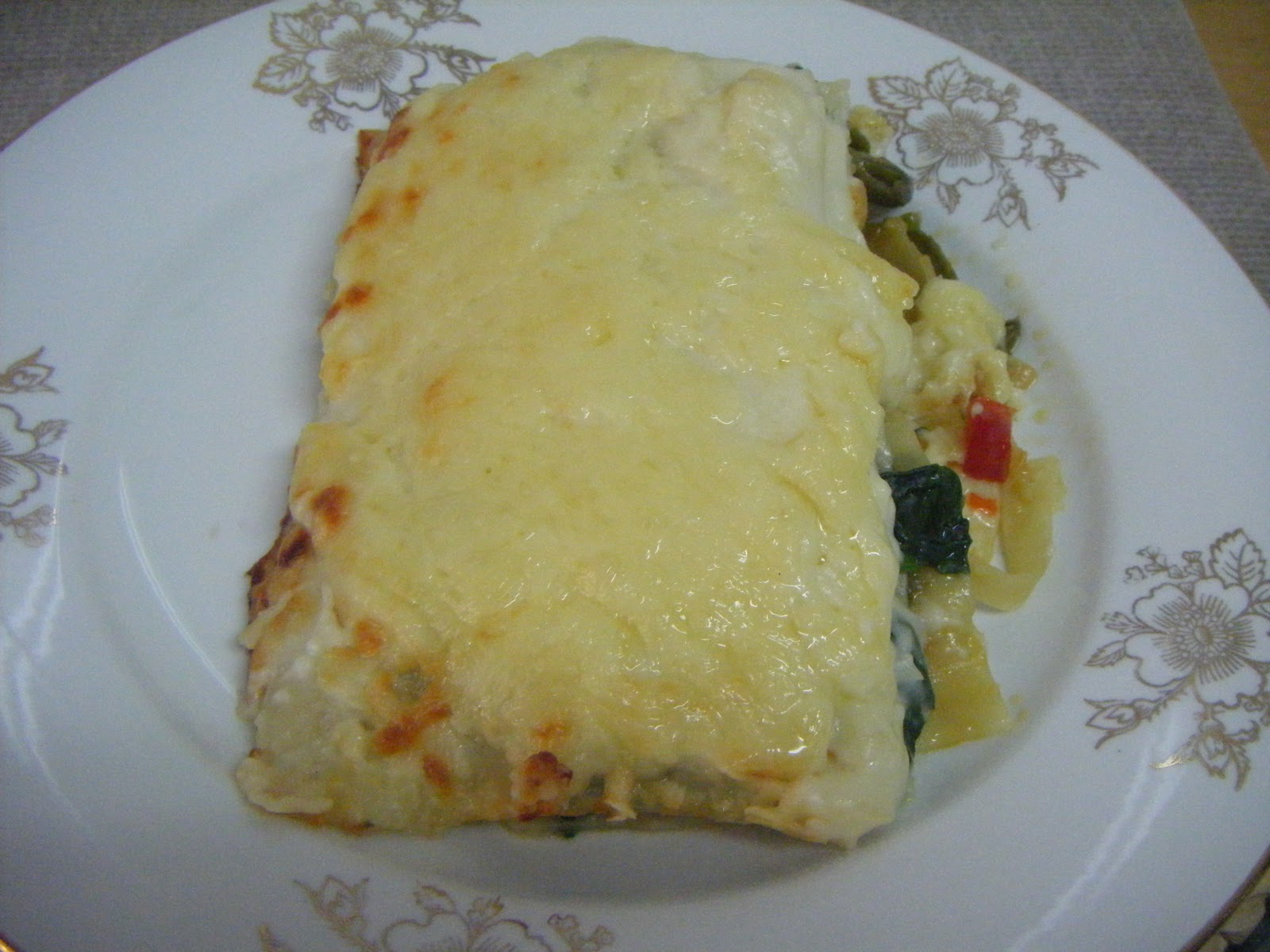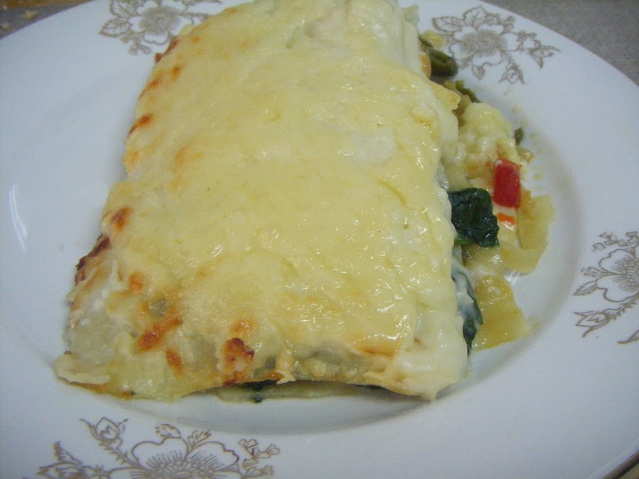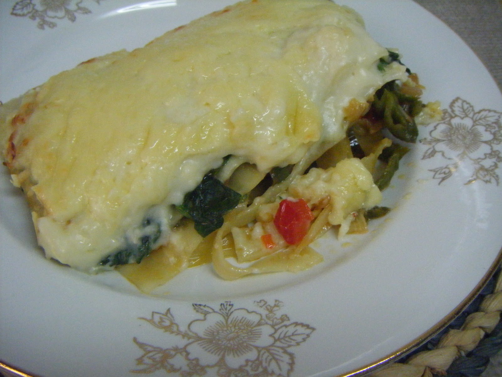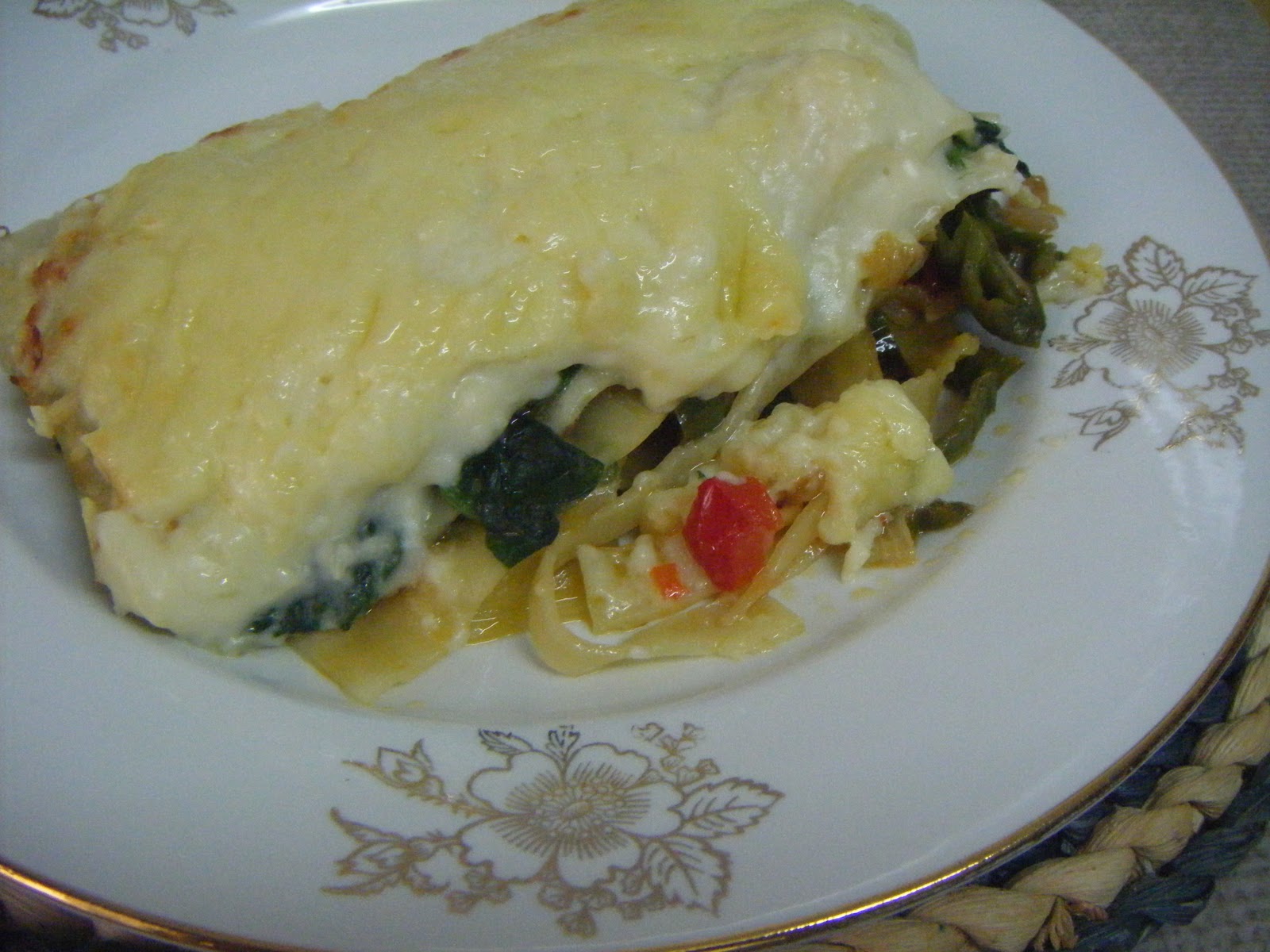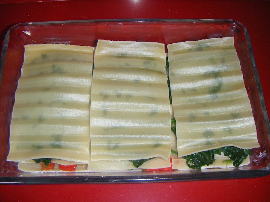 Y ahora ya podemos montar la lasaña. En una fuente que se pueda hornear disponemos las tres primeras como base. Encima ponemos el refrito de cebolla y pimientos. Ponemos las otras tres placas de lasaña. Encima las espinacas con jamón y nuevamente las tres ultimas placas.