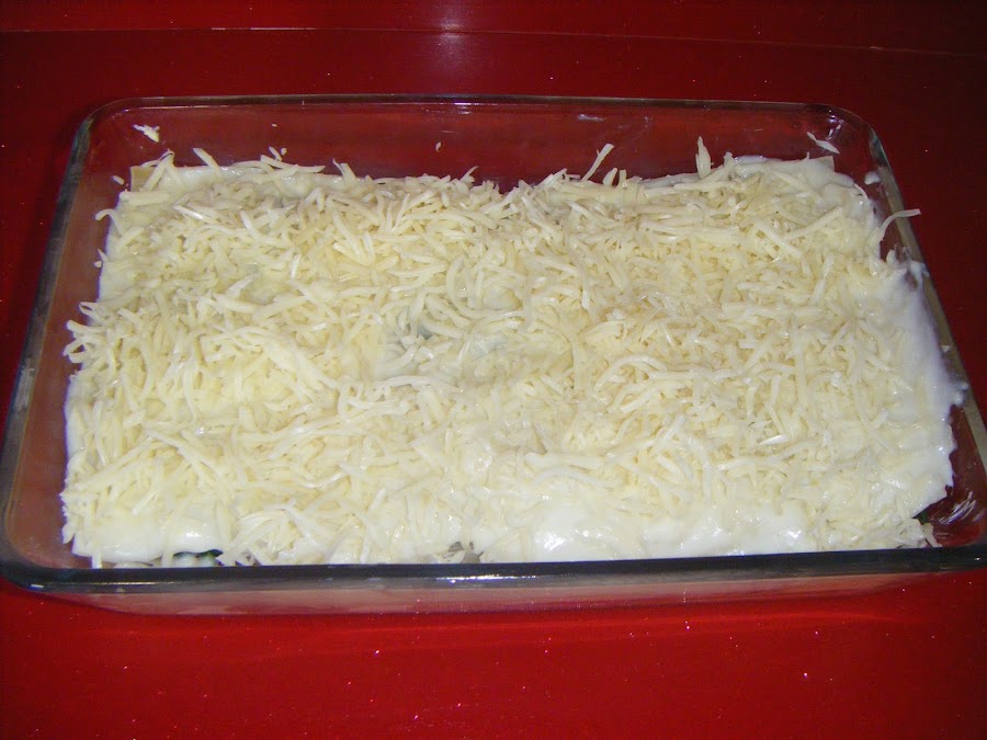 La bechamel la ponemos sobre la lasaña y espolvoreamos con queso rallado.