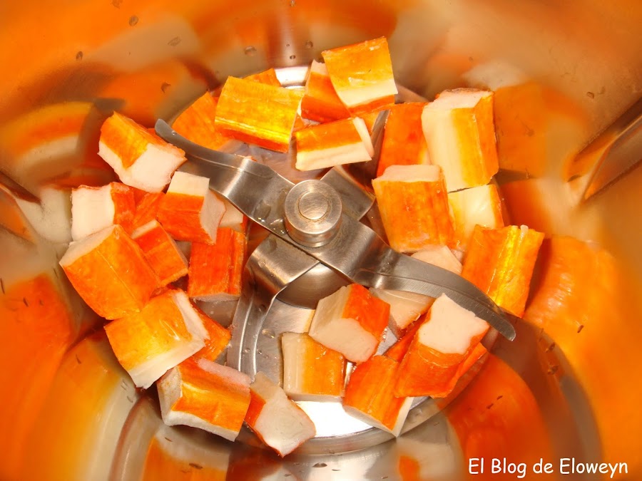 Poned en el vaso de la Thermomix los palitos de cangrejo partidos en trozos. Si no tenéis Thermomix, podéis picarlos con una picadora normal, o hacerlo a mano.