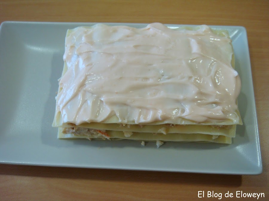 Repetir el proceso hasta tener tres capas de lasaña. Una vez tengáis las tres capas, cubrid la lasaña con salsa rosa por encima.
