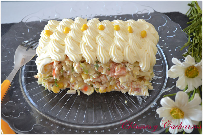 Ir montando la lasaña, una lámina untar con mahonesa y poner encima el relleno, otra lámina, mahonesa y relleno, así hasta terminar con la última lámina. Esta cubrirla con mahonesa y decorar con maíz o aceitunas como más te guste. Guardar en el frigo unas dos horas para que se enfríe y servir.