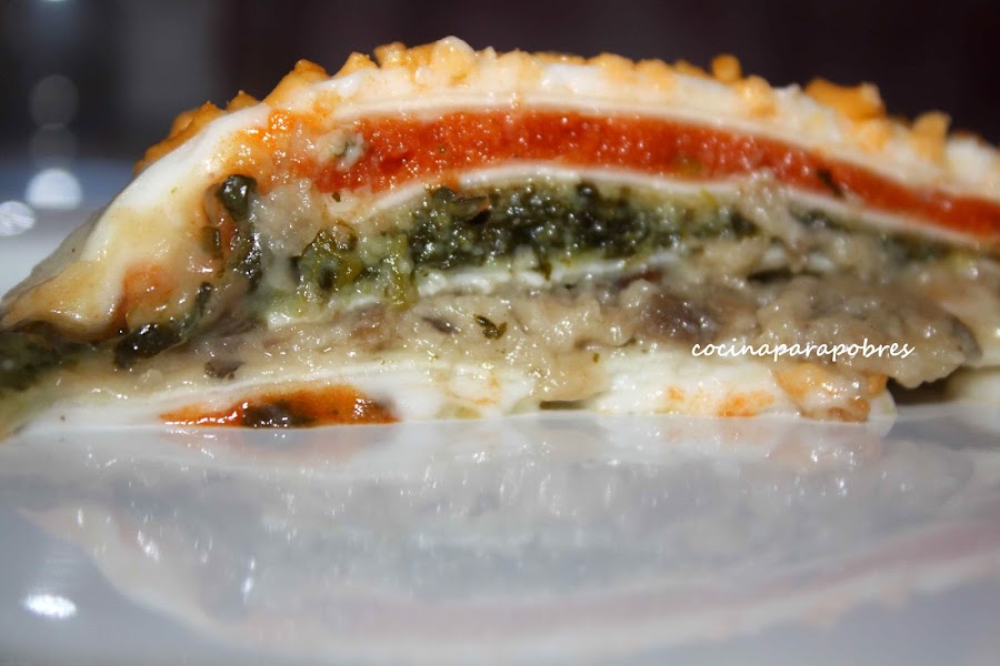 Como podemos observar en la imagen, tiene tres capas de relleno : espinacas, pisto y setas, una mezcla muy rica de sabores.