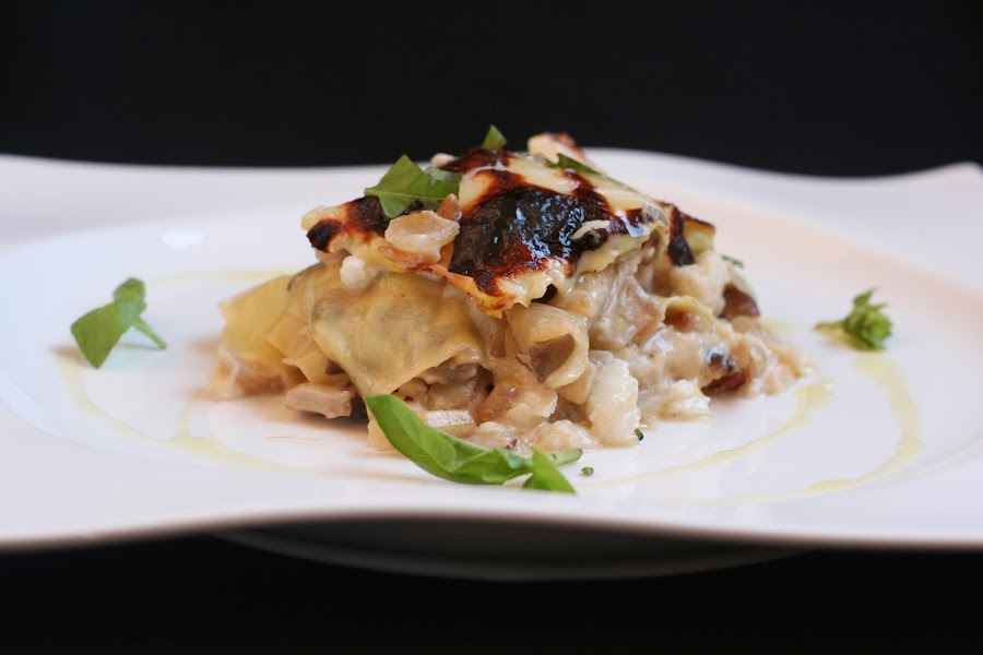 Yo he usado unas láminas de lasaña fresca de Giovanni Rana que no necesitan cocerse previamente. Si usáis lasaña de otro tipo tendréis que cocerla previamente según las instrucciones del envase.