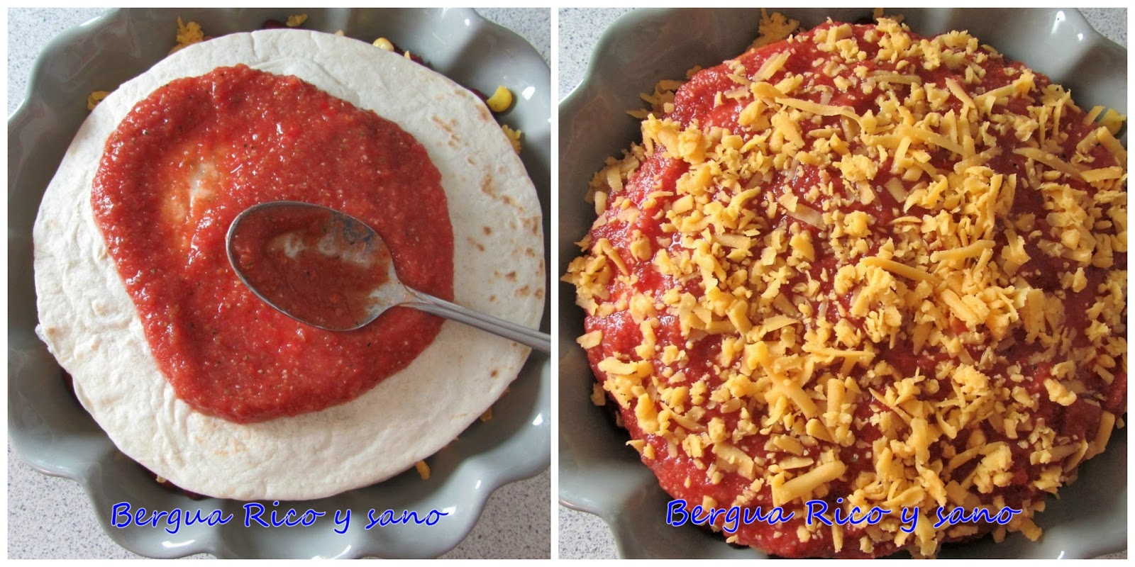 4. Colocamos la primera tortita de base en un recipiente redondo apto para horno. Sobre la tortita repartimos parte de la mezcla de frijoles y maíz. Entonces espolvoreamos con el queso rallado. Finalmente cubrimos con salsa. Primer piso terminado.