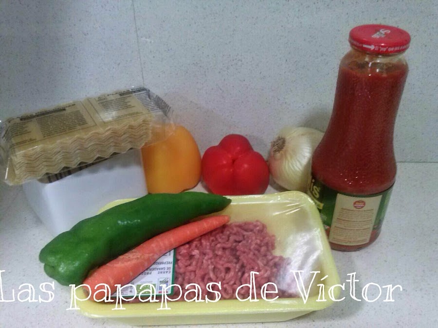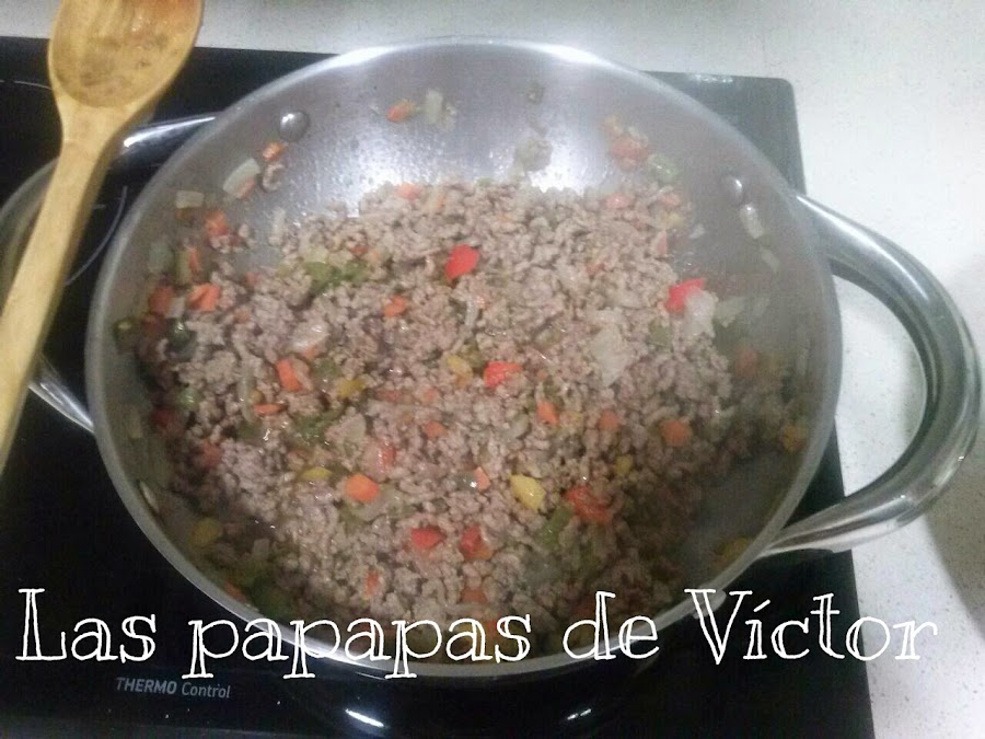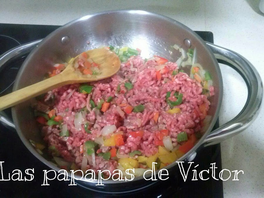 Ponéis a sofreír todas las verduras con un poco de aceite a la que veáis que están casi pochadas añadís la carne picada y sazonais