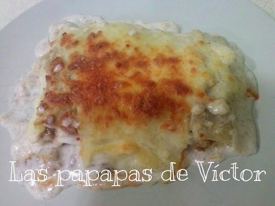 Por capas vais poniendo; primero una placa de lasaña, después una cucharada de carne y así alternando hasta completar tres pisos y tapáis por ultimo con la placa de lasaña