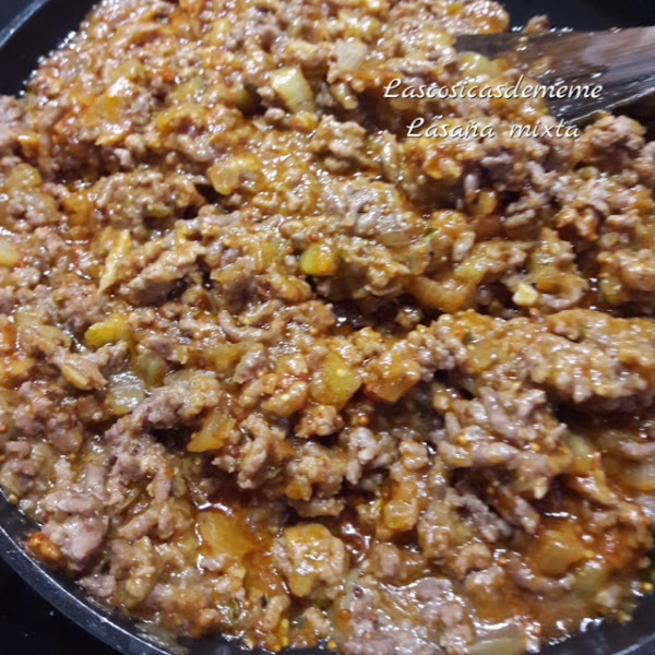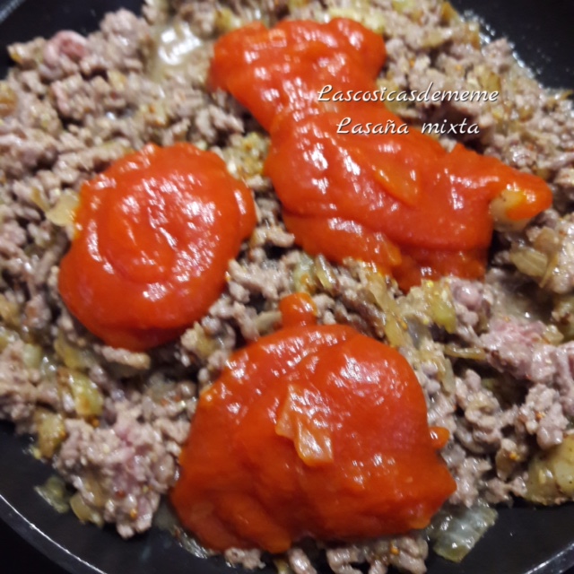 Apagamos el fuego y añadimos las cuatro cucharadas de tomate (este un poco a gusto) mezclamos bien y ya tenemos el relleno de la lasaña terminado.