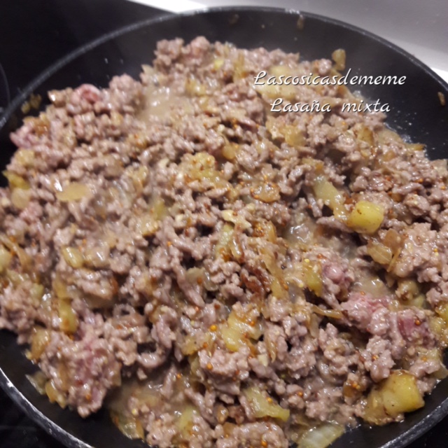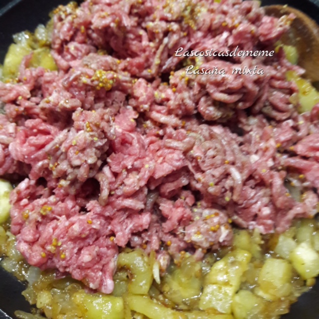 Ponemos el aceite en una sartén, comenzamos sofriendo la cebolla, cuando esté casi pochada, añadimos los trocitos de berenjena, lo pochamos lentamente hasta que la berenjena esté blanda, en este punto subimos el fuego, ponemos la carne la rehogamos hasta que cambie de color, no combine hacerla mucho para que no se seque.