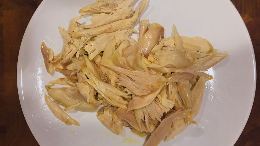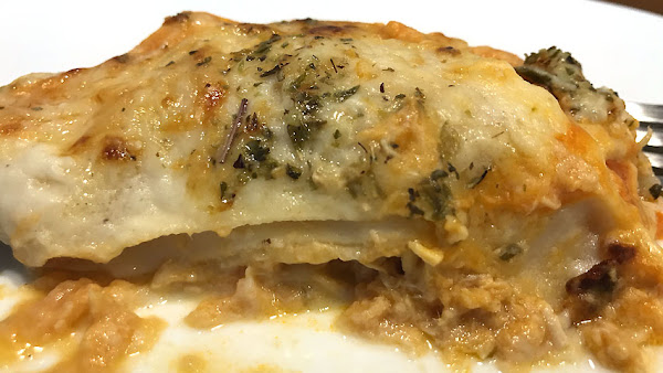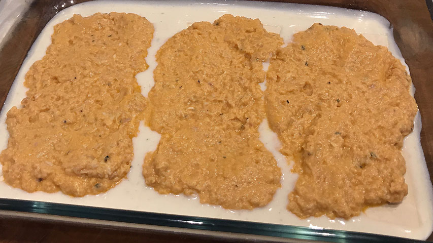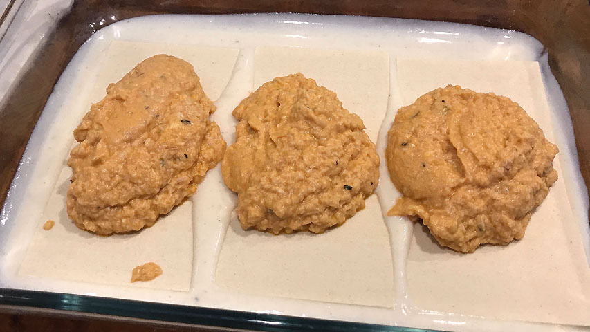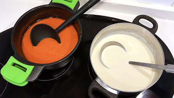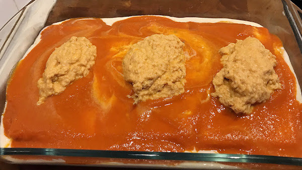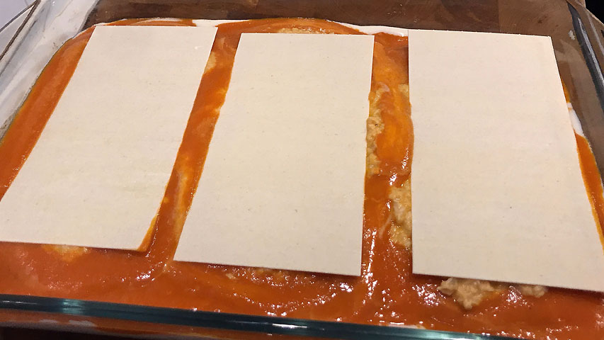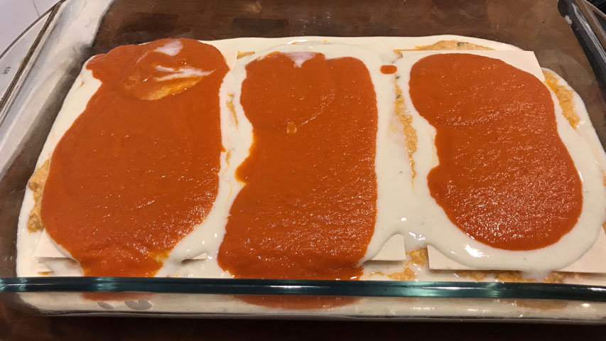 Encima pon otra capa de lasaña, otra de pollo triturado con tomate y otra de bechamel.