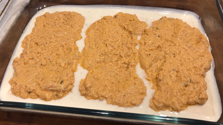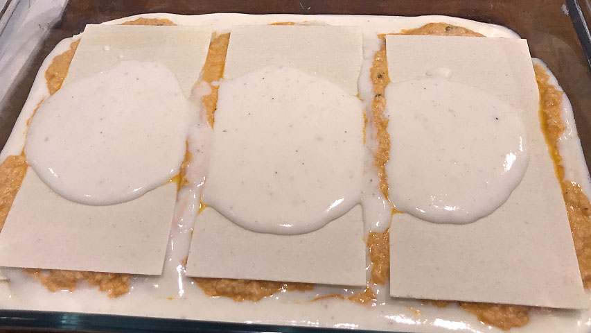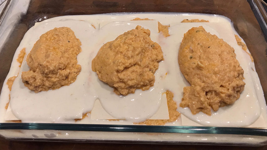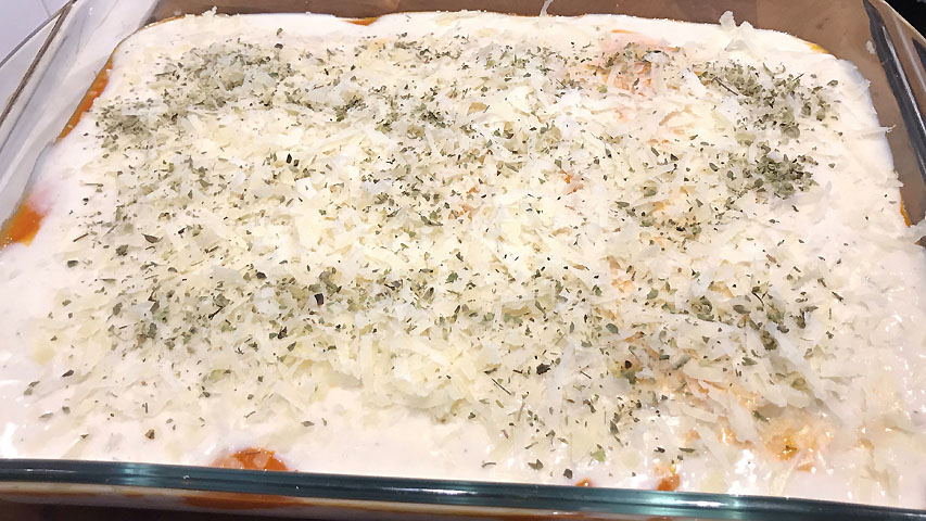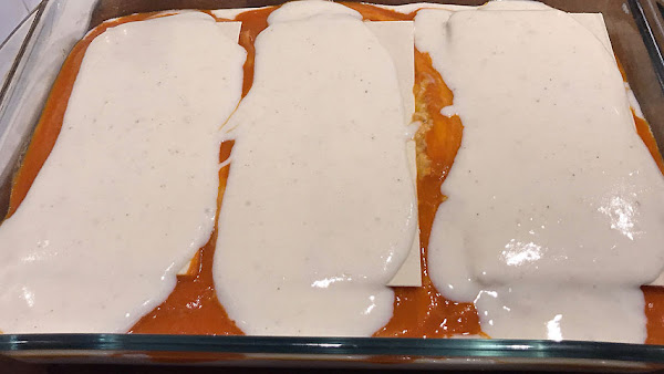 Repite: lasaña, pollo y bechamel cuantas veces gustes. La última capa de bechamel debe ser abundante.