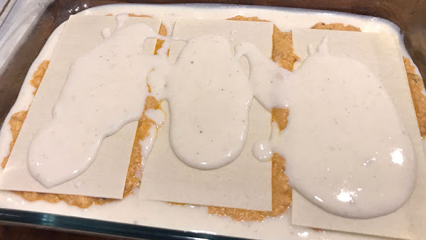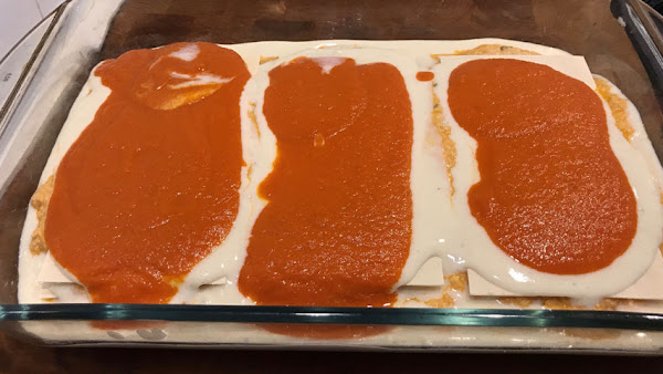 En una bandeja de horno coloca una capa de bechamel, otra de lasaña, otra del pollo triturado con tomate.