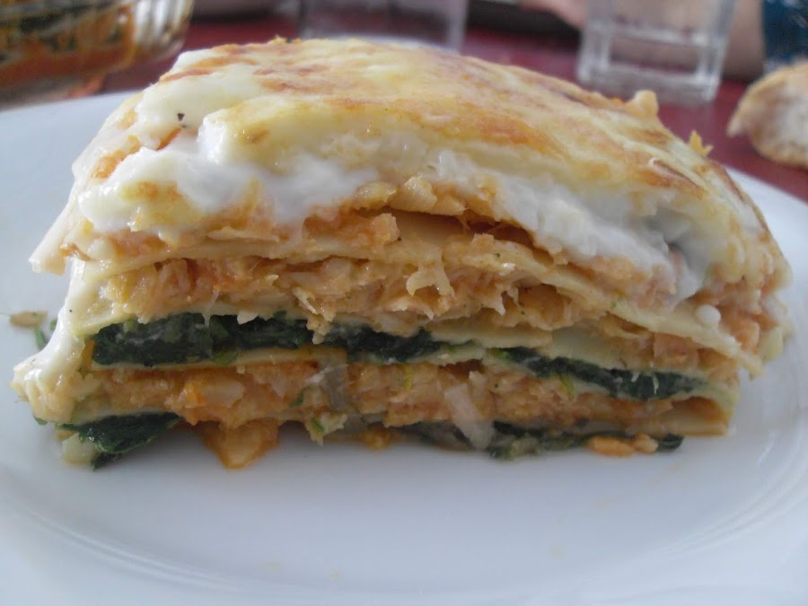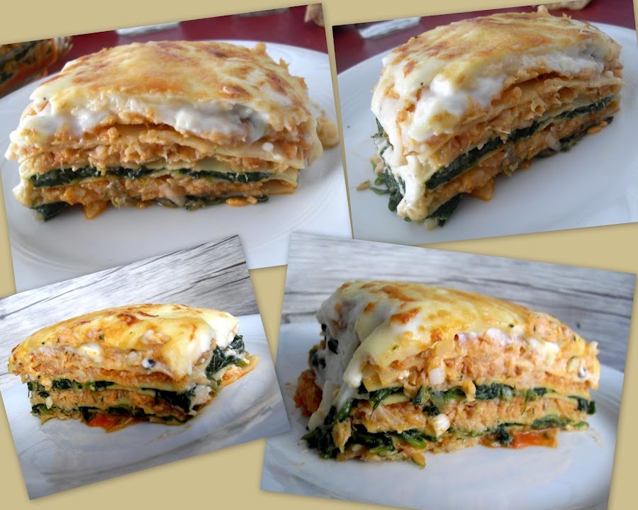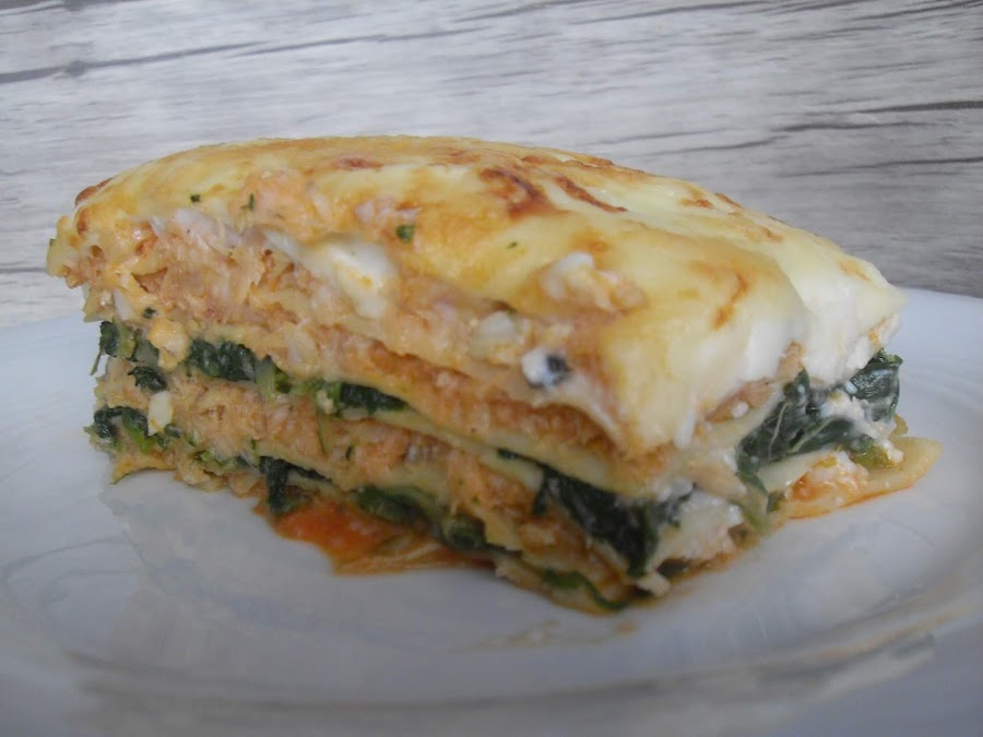 Untar una fuente de horno con con mantequilla. Colocar una capa con las espinacas salteadas, otra capa de pasta y la merluza, y así formar capas alternadas. Cubrir con bechamel y espolvorear con el queso para gratinar sin lactosa. Gratinar en el horno hasta que el queso esté dorado.